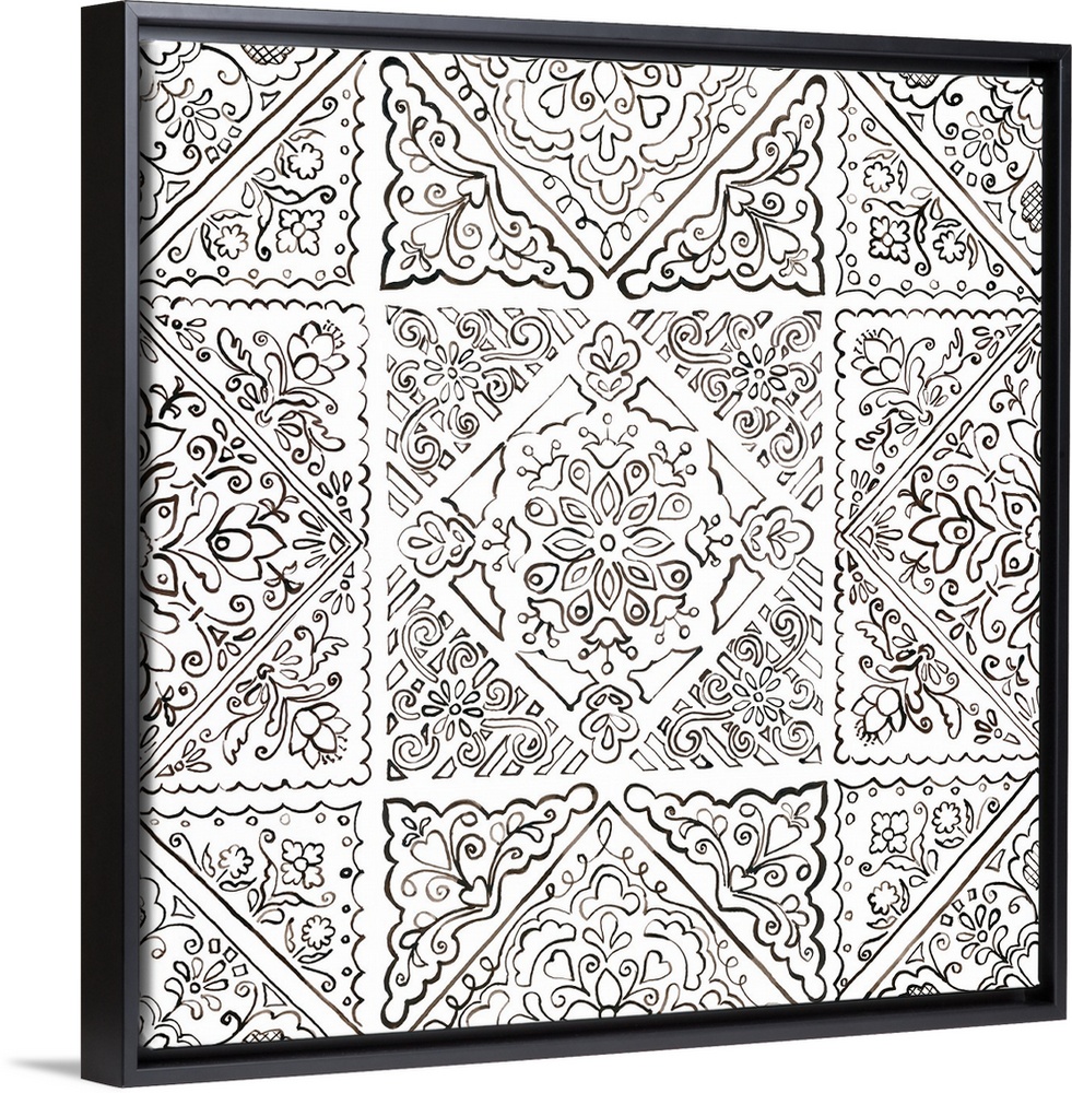 <p>A square decorative image of black and white floral designs in a tile pattern.</p>
