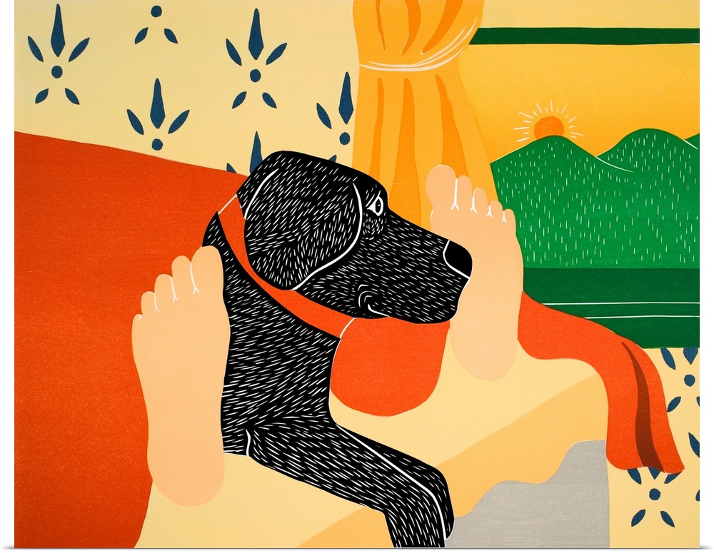<p>Illustration of a black lab laying in the middle of its owners feet at the foot of the bed in the morning.</p>