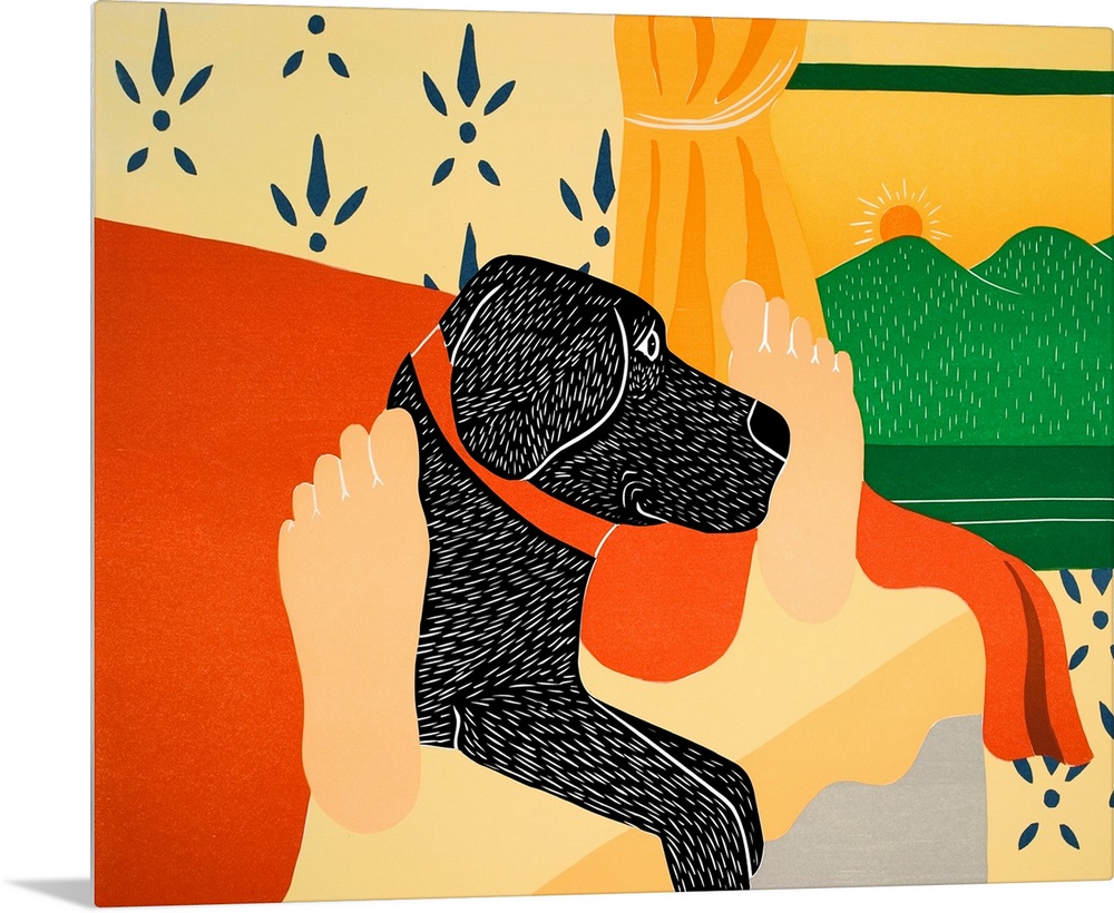 <p>Illustration of a black lab laying in the middle of its owners feet at the foot of the bed in the morning.</p>
