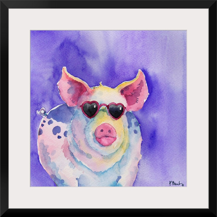 <p>Square watercolor painting of a pig wearing pink heart shaped sunglasses on a purple background.</p>
