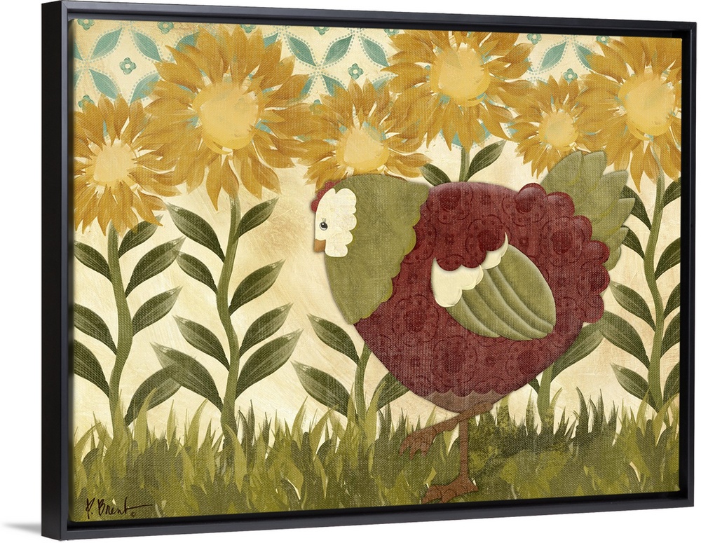 <p>Folk art style illustration of a hen with a row of sunflowers.</p>