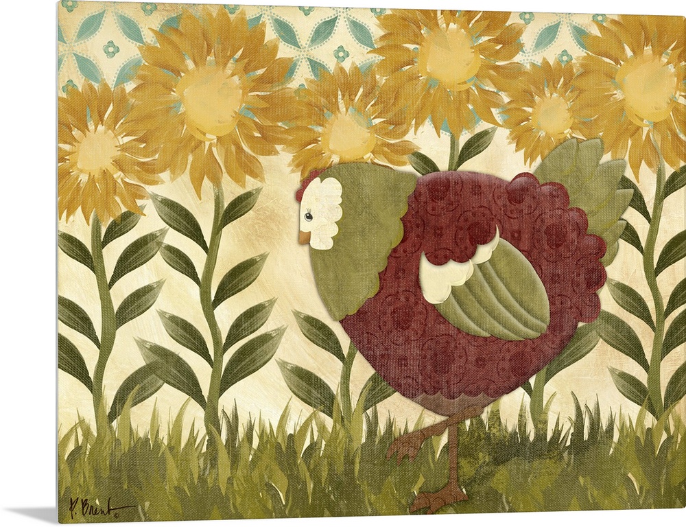 <p>Folk art style illustration of a hen with a row of sunflowers.</p>