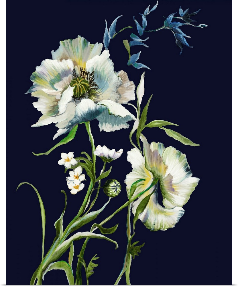 <p>Elegant painterly white flowers with green foliage and blue accents bloom against a deep navy background, offering a sophisticated botanical art piece.</p>