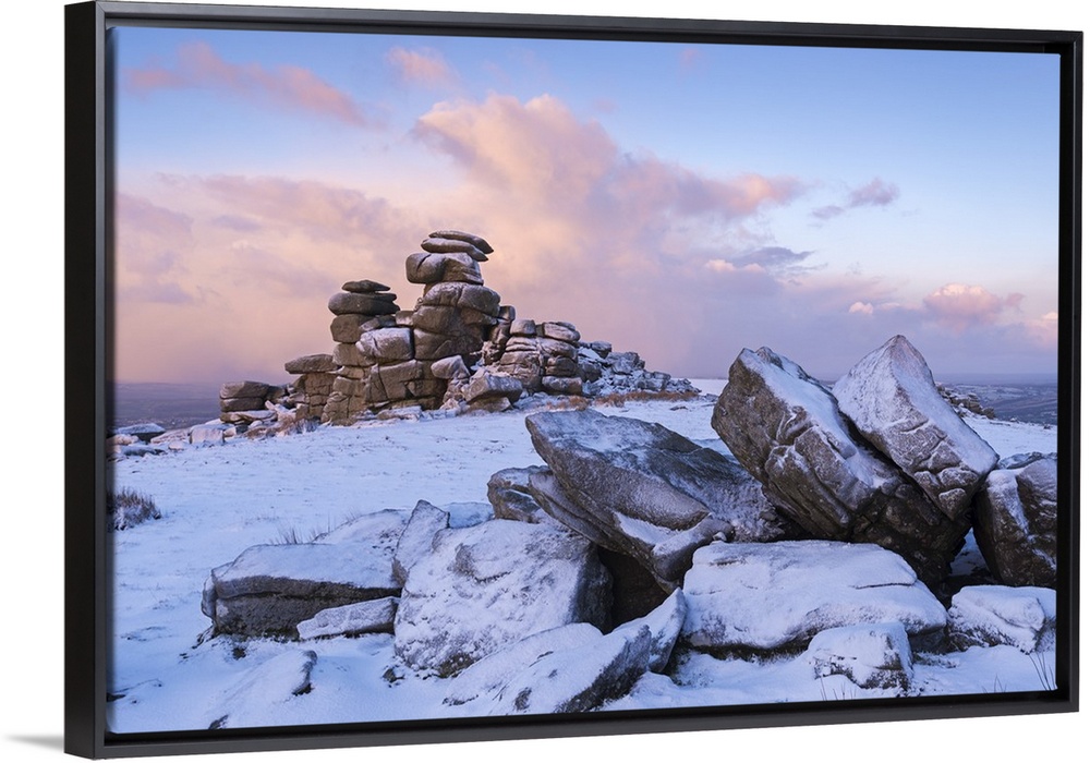 <p>Sunrise above covered rocks at Great Staple Tor, Dartmoor, Devon, England. Winter</p>