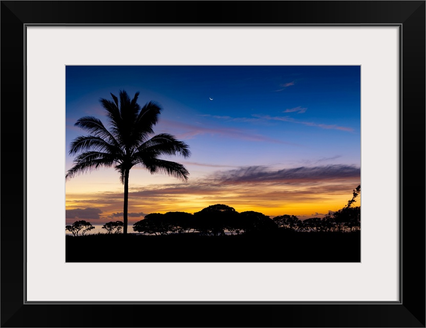 <p>Sunrise and silhouetted palm tree along the Pacific Ocean; Kauai, Hawaii, United States of America</p>