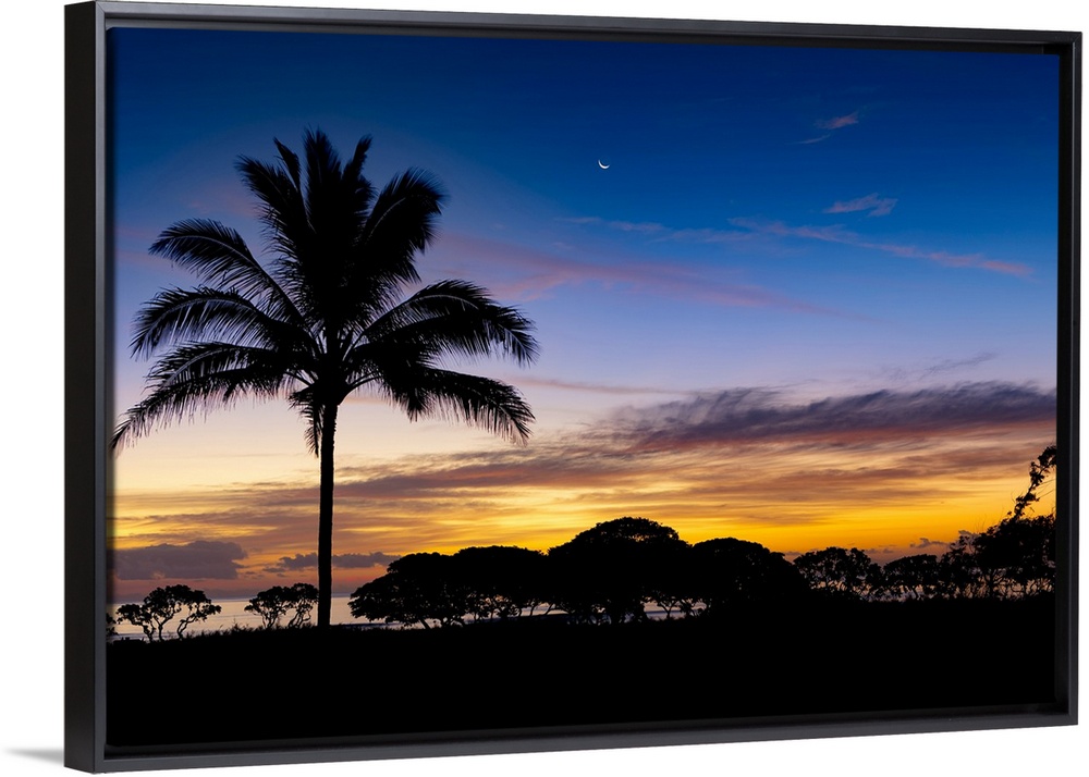 <p>Sunrise and silhouetted palm tree along the Pacific Ocean; Kauai, Hawaii, United States of America</p>