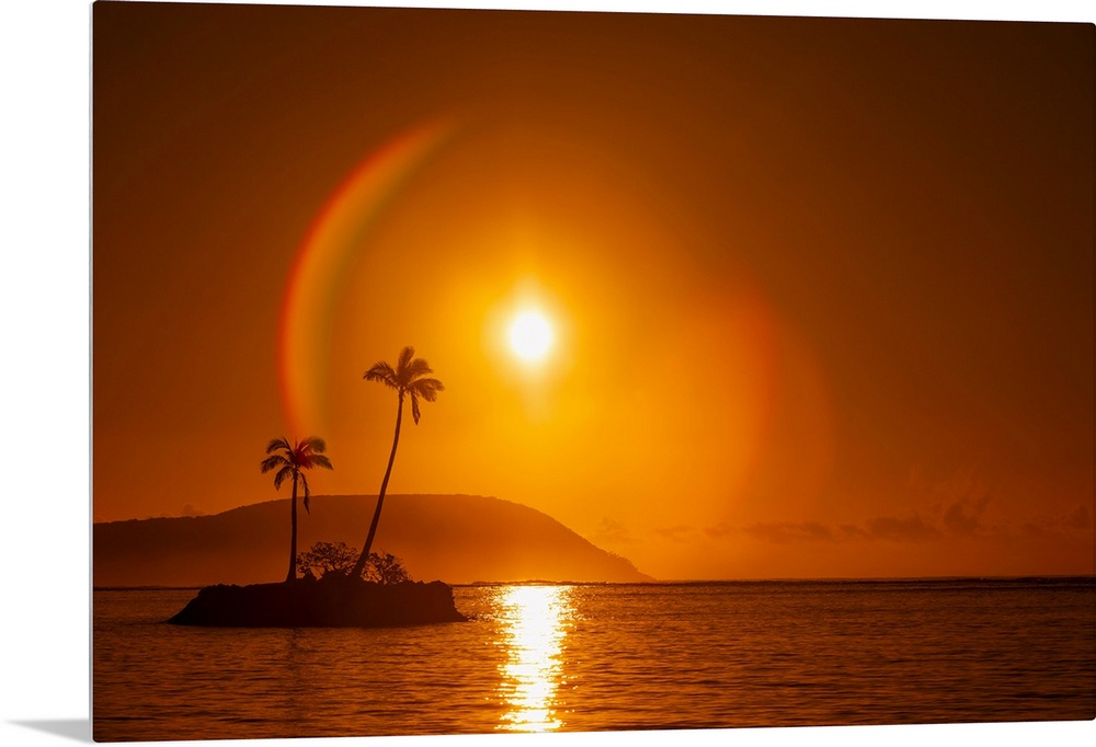 <p>Sunrise at Kahala Beach, Waialae Beach Park, with a flare around the sun in a glowing red sky reflected in the tranquil water Oahu, Hawaii, United States of America.</p>