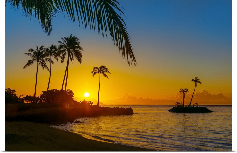 <p>Sunrise at Kahala Beach, Waialae Beach Park, with a glowing yellow sun and warm coloured lights reflected in the tranquil water Oahu, Hawaii, United States of America.</p>