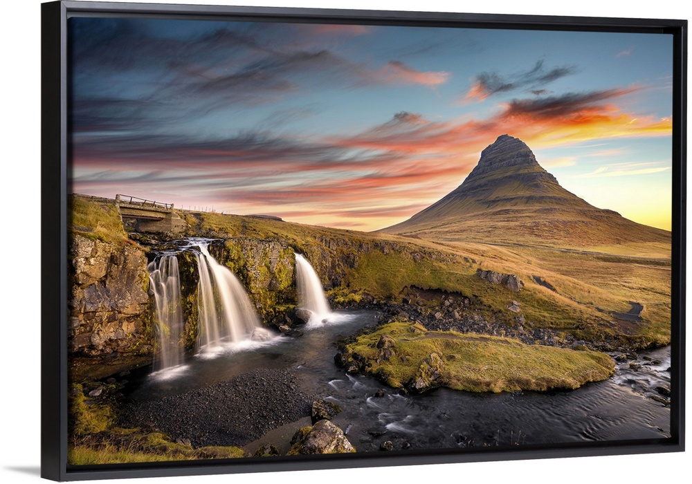 <p>Sunrise at Kirkjufell Mountain overlooking a small waterfall, Iceland, Polar Regions</p>