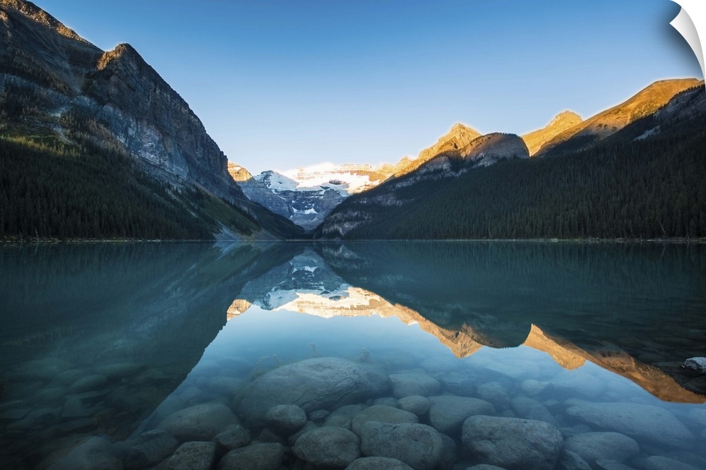 <p>Sunrise at the Lake Louis. Sun light made mountain tops golden along with reflections on the water.</p>