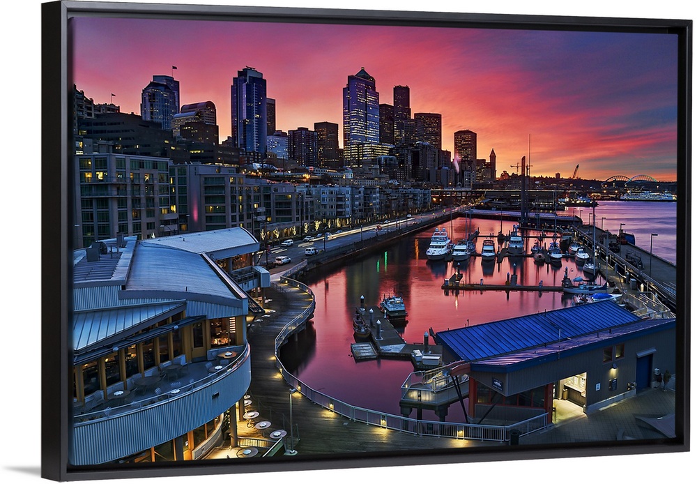 <p>Big canvas photo art of downtown Seattle meeting a harbor with a vibrant sunset in the distance.</p>