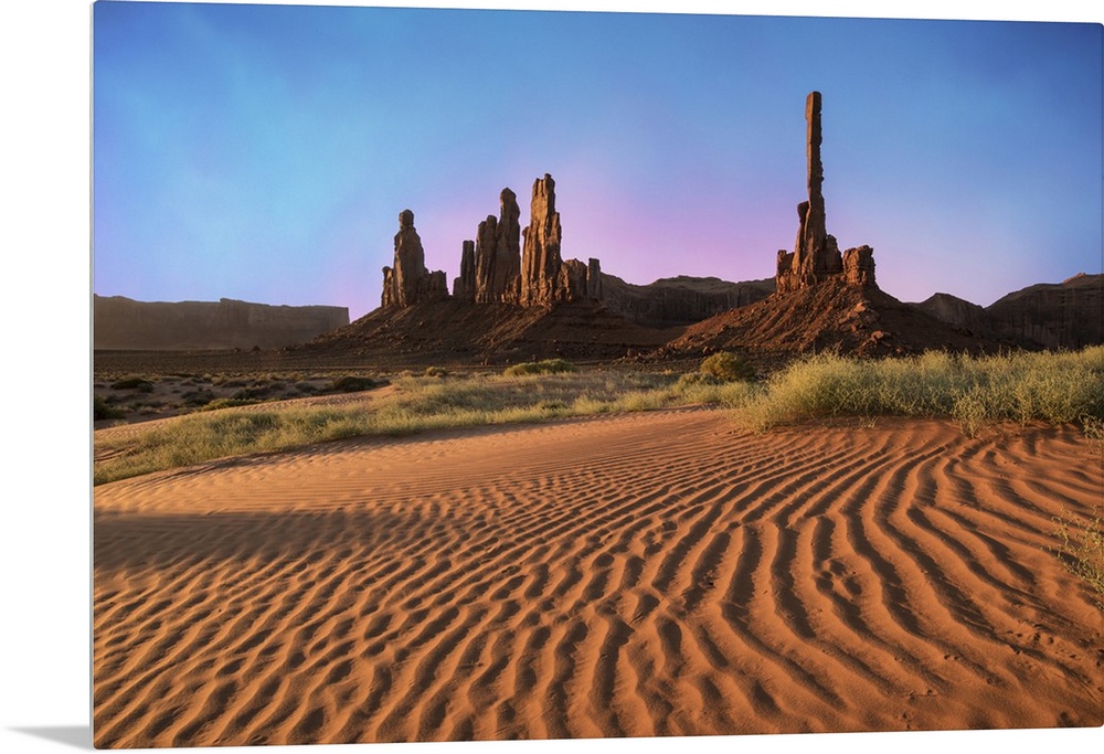 <p>Sunrise at Totem Pole and Y'ei Bi Chei in Monument Valley, Arizona</p>