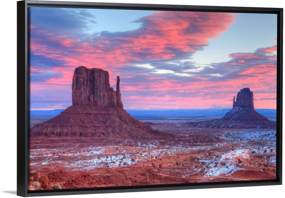<p>Sunrise, West Mitten Butte on left and East Mitten Butte on right, Monument Valley Navajo Tribal Park, Utah</p>