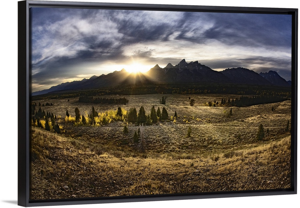 <p>Giant, landscape photograph of a vast field in Jackson Hole, Wyoming, the sun rising just above the Gran Tetons in the background.</p>