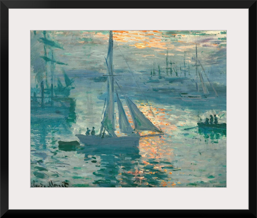 <p>Sunrise (Marine), by Claude Monet, 1873-74, French impressionist painting, oil on canvas. Claude Monet painted the coastal port of Le Havre at dawn as brilliant orange of the rising sun glimmers against the dull blues and greens of the water</p>