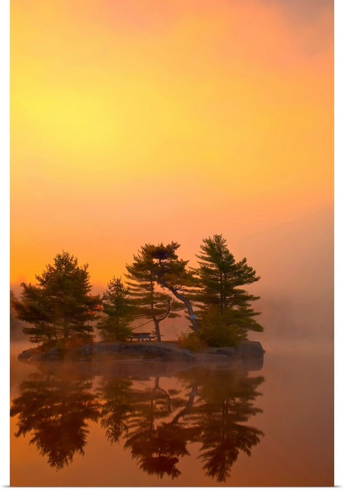 <p>Sunrise Colours With Autumn Morning Mists At Dollar Lake, Dollar Lake Provincial Park; Nova Scotia, Canada</p>