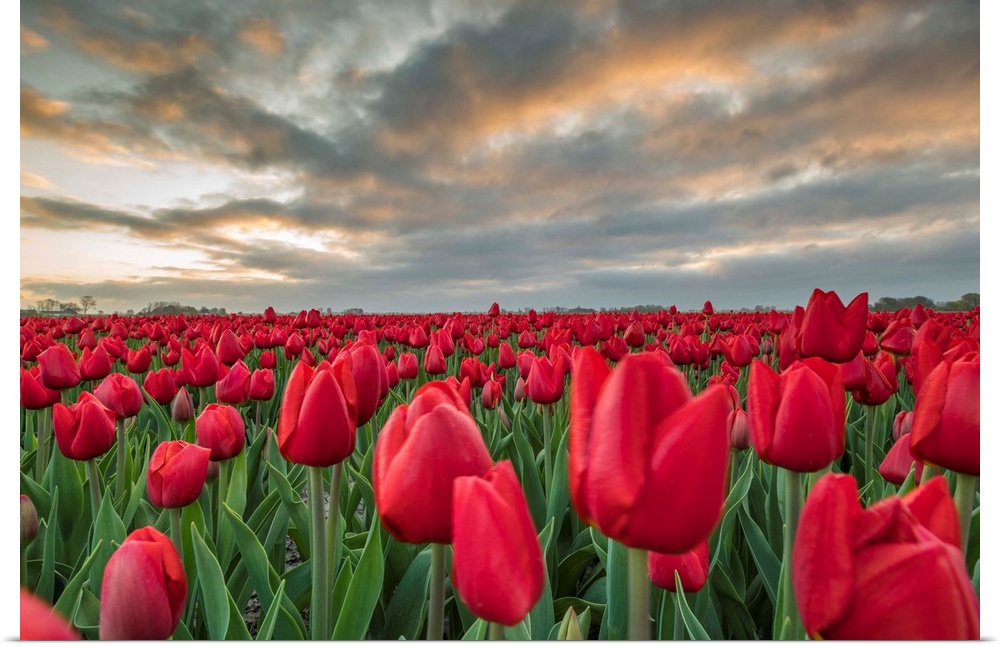 <p>Sunrise Coloured Clouds Above Field Of Red Tulips. Koggenland, North Holland Province, Netherlands.</p>