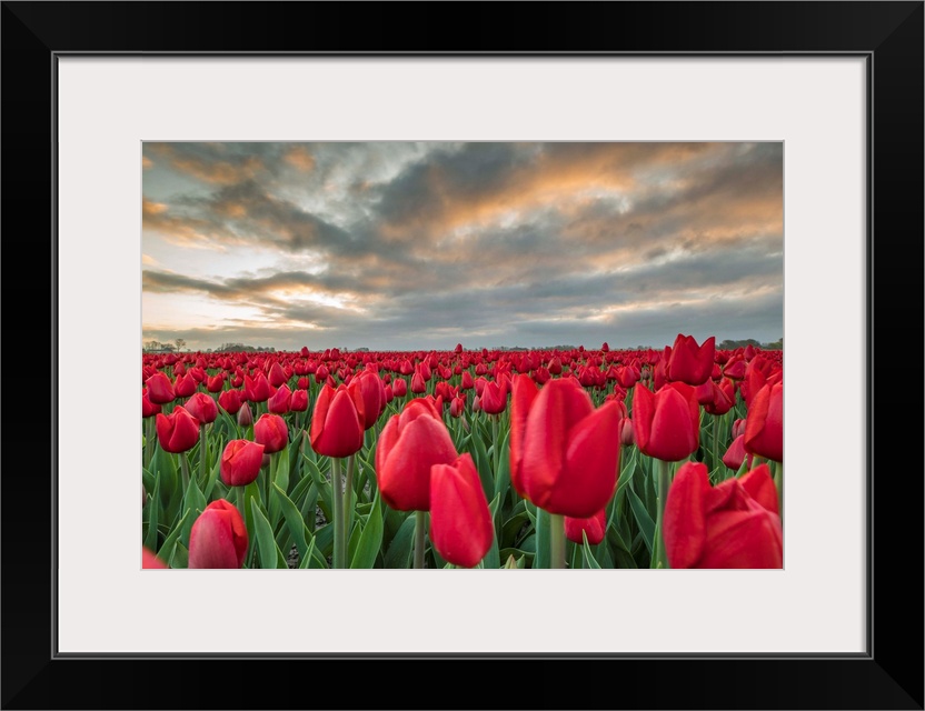 <p>Sunrise Coloured Clouds Above Field Of Red Tulips. Koggenland, North Holland Province, Netherlands.</p>