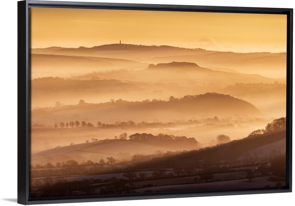 <p>Frosty winter sunrise from Lambert's Castle looking across the Marshwood Vale towards Hardy's Monument, Dorset, England, UK.</p>