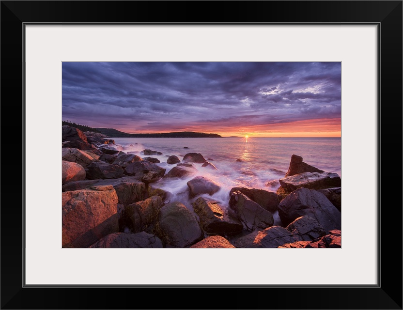 <p>Sunrise from rocky coast of Acadia National Park, Maine, USA.</p>