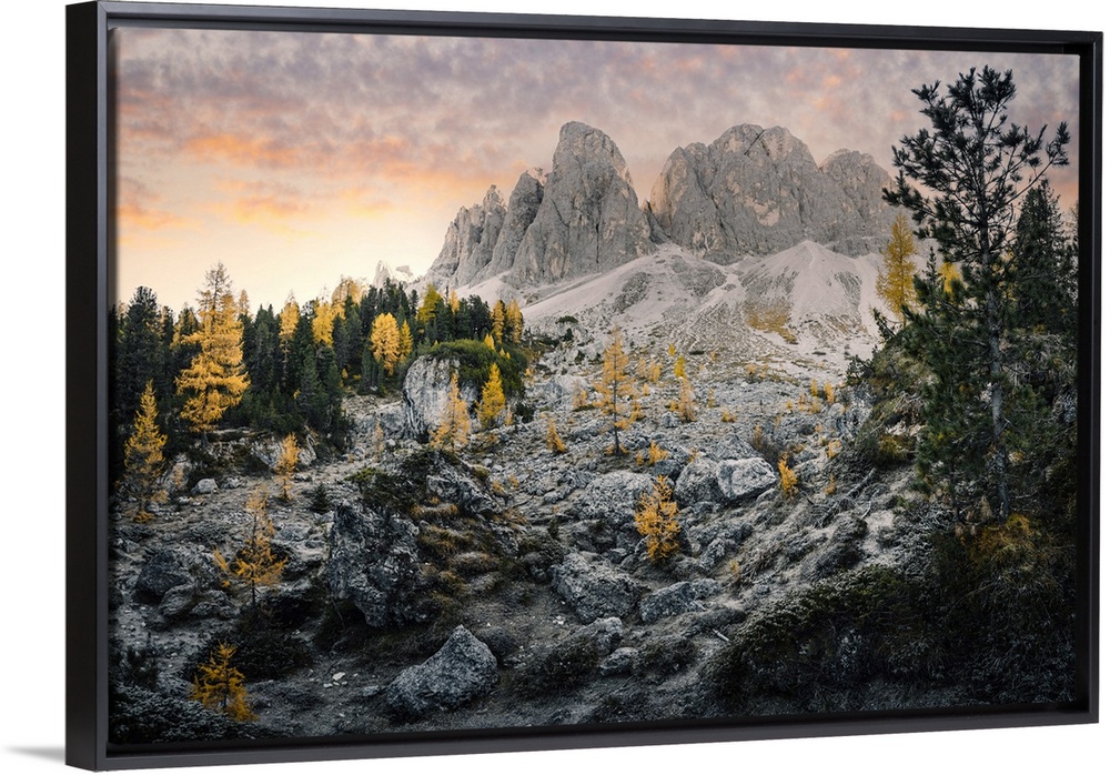<p>Sunrise in Odle Mountains group with yellow trees, Funes Valley, South Tyrol, Italy</p>
