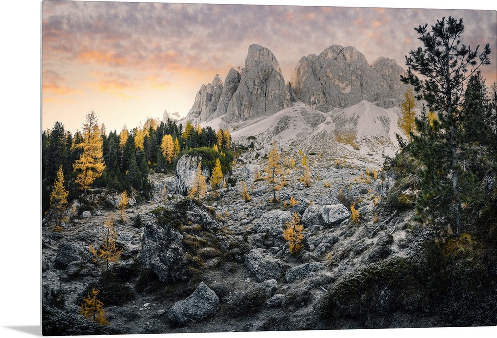 <p>Sunrise in Odle Mountains group with yellow trees, Funes Valley, South Tyrol, Italy</p>