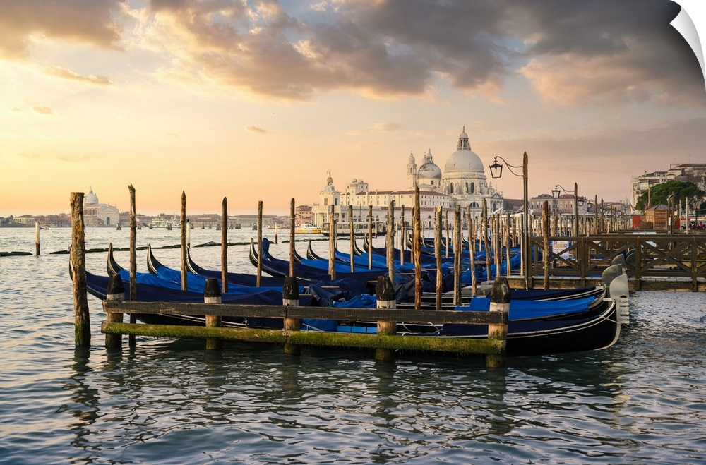 <p>Sunrise in Venice with gondolas and Santa Maria della Salute church on the background. Venice, Veneto, Italy.</p>