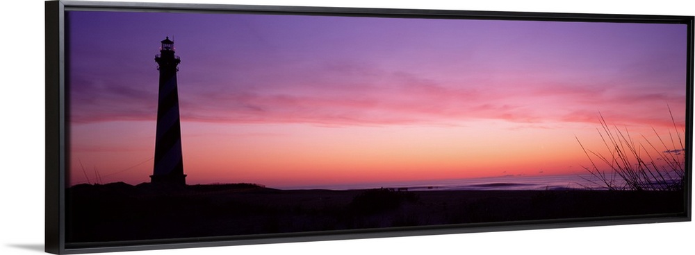<p>A panoramic canvas with a pastel colored sky with a light house towering over the sandy beach on the left side of this photograph.</p>
