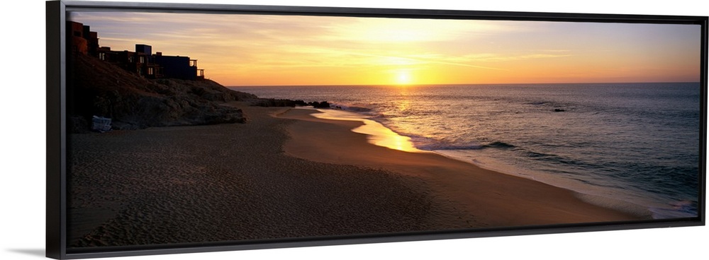 <p>Panoramic photo of the sun rising over the beach in Los Cabos, Mexico.</p>