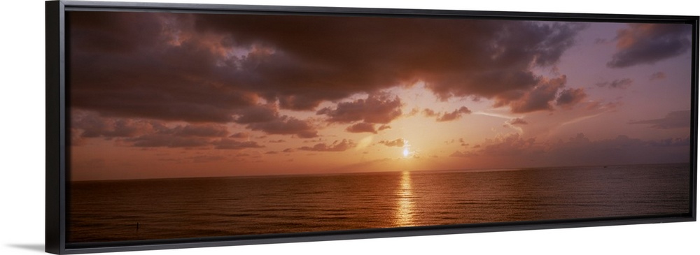 <p>Panoramic photograph of ocean at dawn under a cloudy sky.</p>