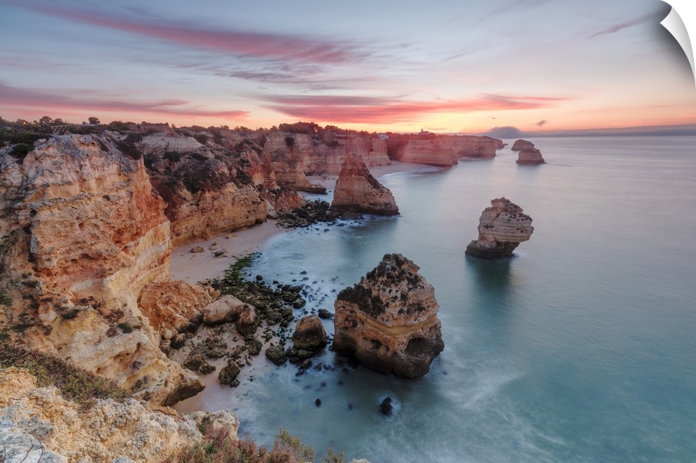 <p>Sunrise on cliffs framed by turquoise water of the ocean, Praia da Marinha, Caramujeira, Lagoa Municipality, Algarve, Portugal</p>
