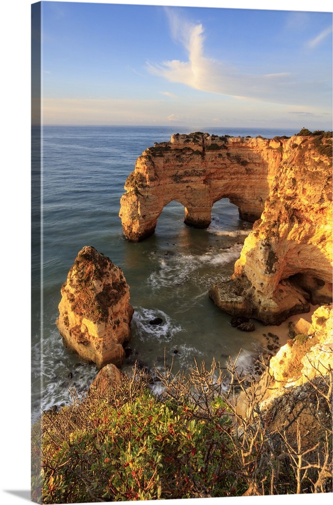<p>Sunrise on cliffs framed by turquoise water of the ocean, Praia da Marinha, Caramujeira, Lagoa Municipality, Algarve, Portugal</p>