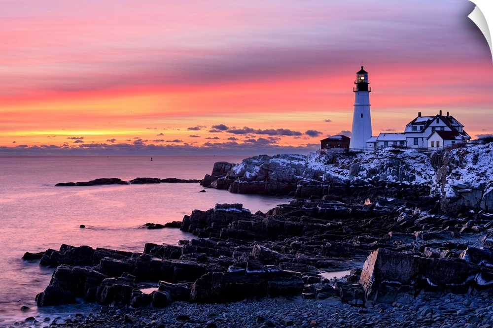 <p>Sunrise on coast at Portland Head Lighthouse, Cape Elizabeth, Maine, USA.</p>