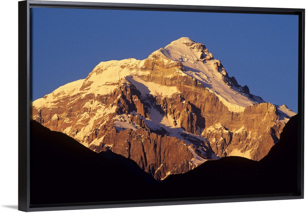 <p>Sunrise on east face of 22,841' Cerro Aconcagua, highest mountain in the Andes, viewed from the Vacas Valley, Argentina.</p>