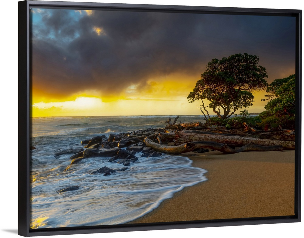 <p>Sunrise over driftwood and rocks on a Hawaiian shore; Kauai, Hawaii, United States of America</p>