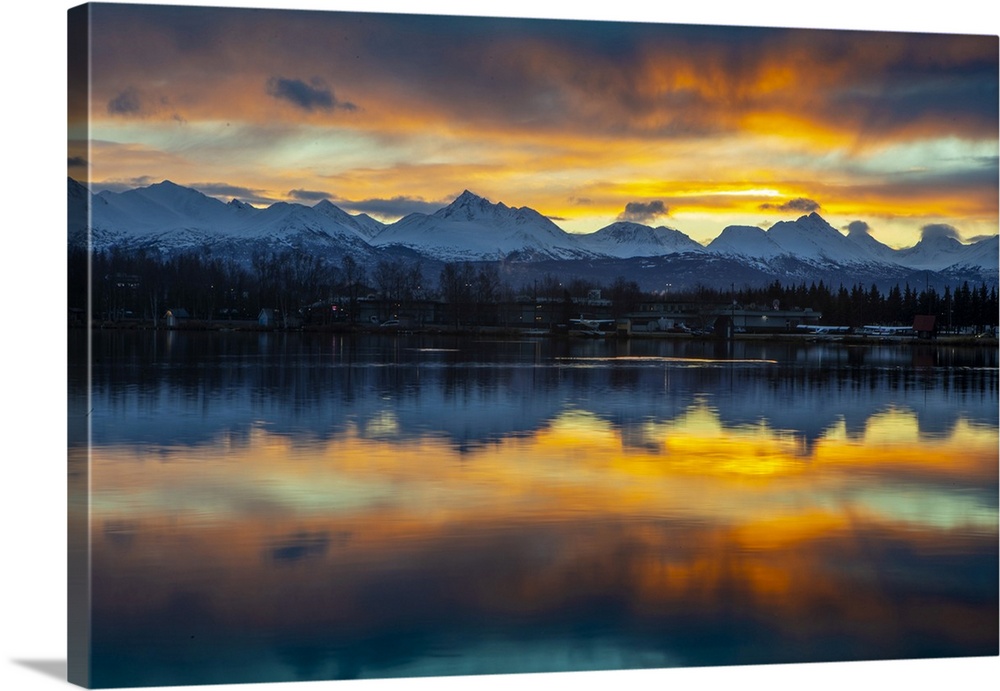 <p>Sunrise on a late autumn, early winter day reflecting on Lake Spenard, with float planes in the shadows, and snow-covered Chugach Mountains in the background, Anchorage, Alaska, USA, Anchorage, Alaska, United States of America</p>