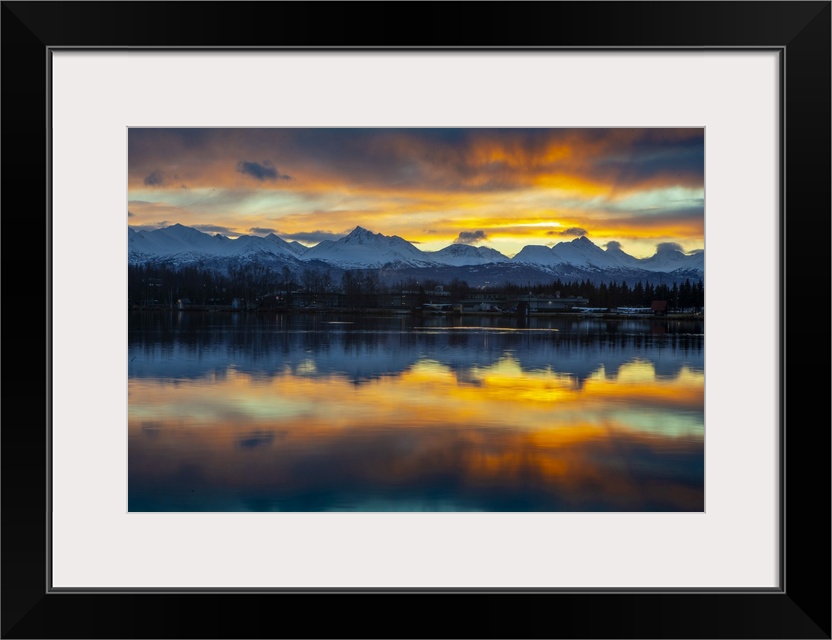 <p>Sunrise on a late autumn, early winter day reflecting on Lake Spenard, with float planes in the shadows, and snow-covered Chugach Mountains in the background, Anchorage, Alaska, USA, Anchorage, Alaska, United States of America</p>