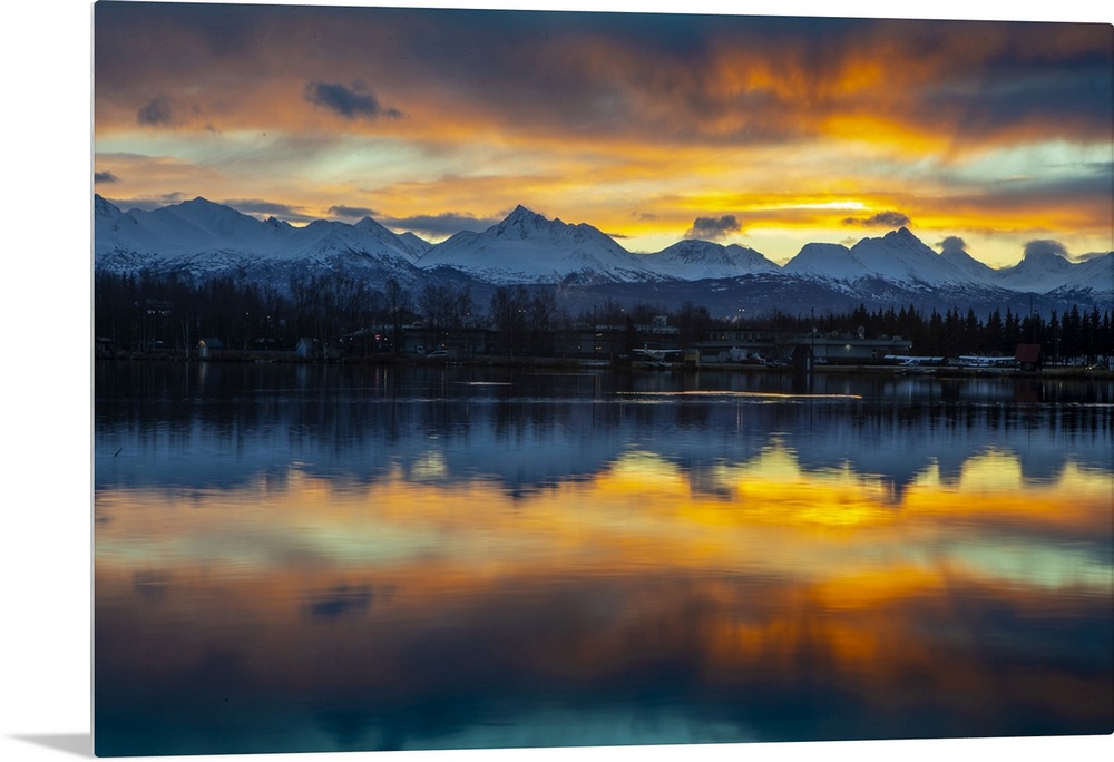 <p>Sunrise on a late autumn, early winter day reflecting on Lake Spenard, with float planes in the shadows, and snow-covered Chugach Mountains in the background, Anchorage, Alaska, USA, Anchorage, Alaska, United States of America</p>