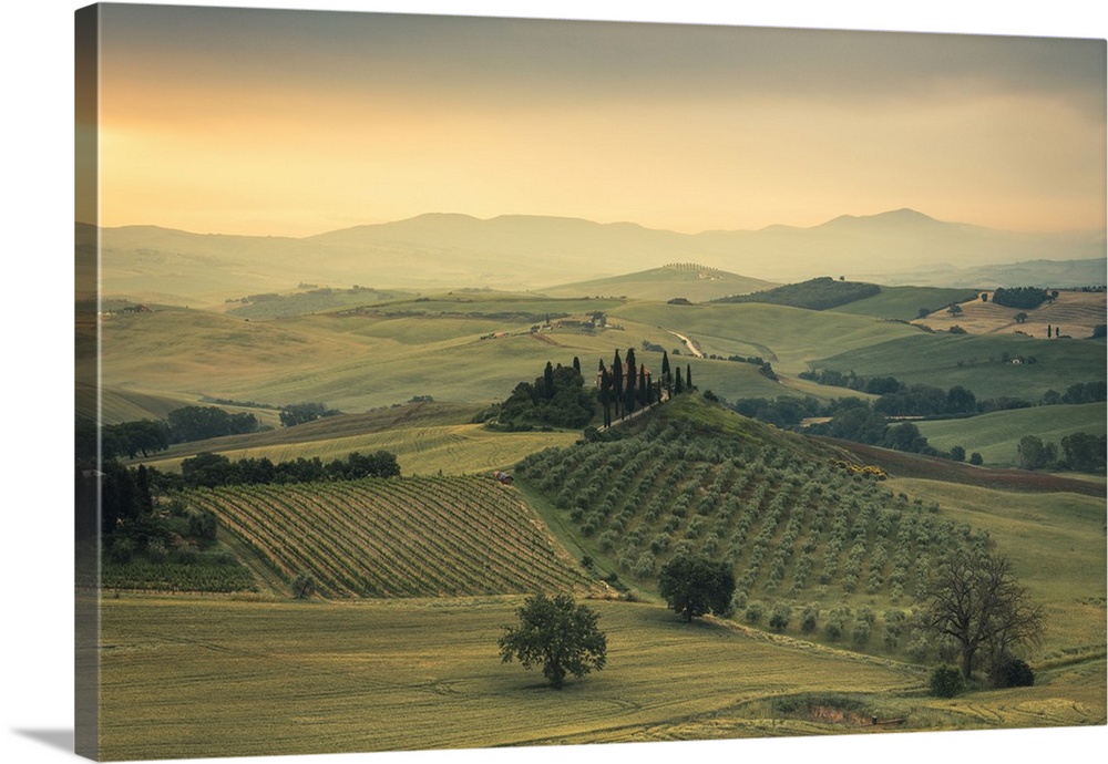 <p>Sunrise on the gentle green hills of Val d'Orcia, Province of Siena, Tuscany, Italy</p>