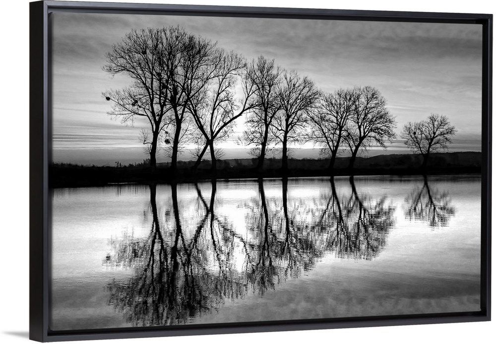 <p>A black and white photograph of a line of trees reflecting in a canal below.</p>
