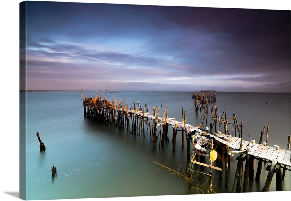 <p>Sunrise and clouds on the Palafito Pier in the Carrasqueira Natural Reserve of Sado River, Alcacer do Sal, Setubal, Portugal</p>