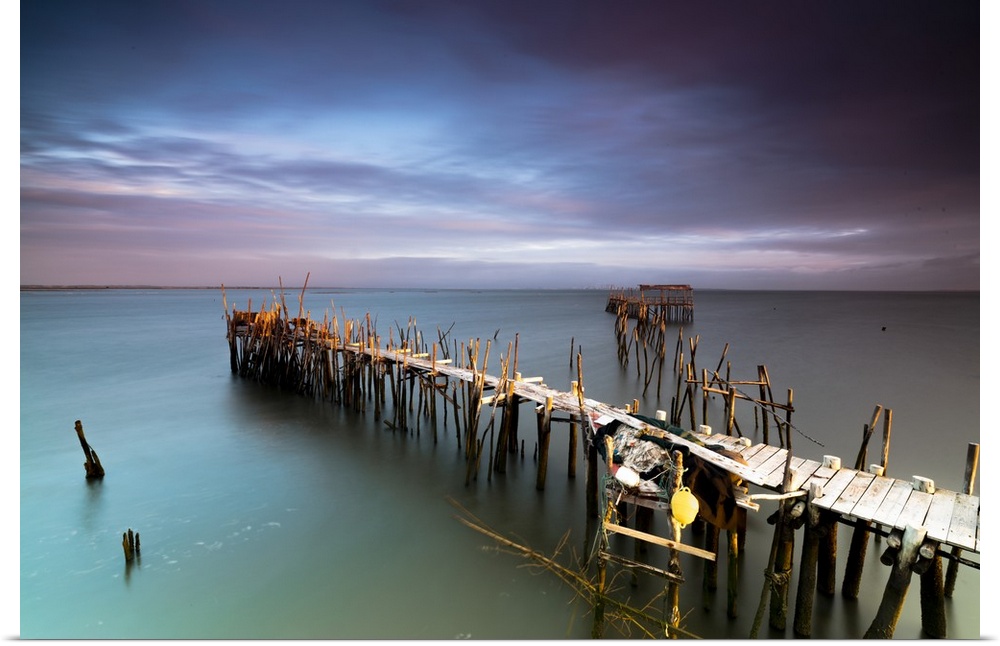 <p>Sunrise and clouds on the Palafito Pier in the Carrasqueira Natural Reserve of Sado River, Alcacer do Sal, Setubal, Portugal</p>