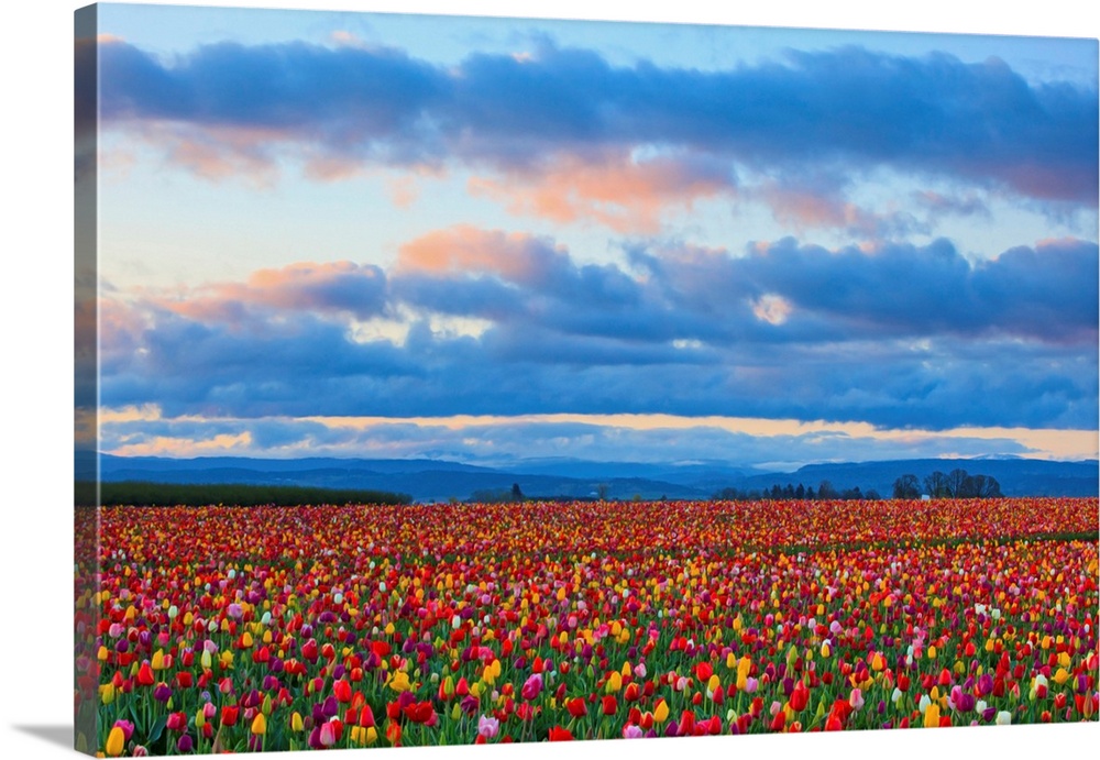 <p>Sunrise Over A Tulip Field At Wooden Shoe Tulip Farm, Woodburn, Oregon</p>