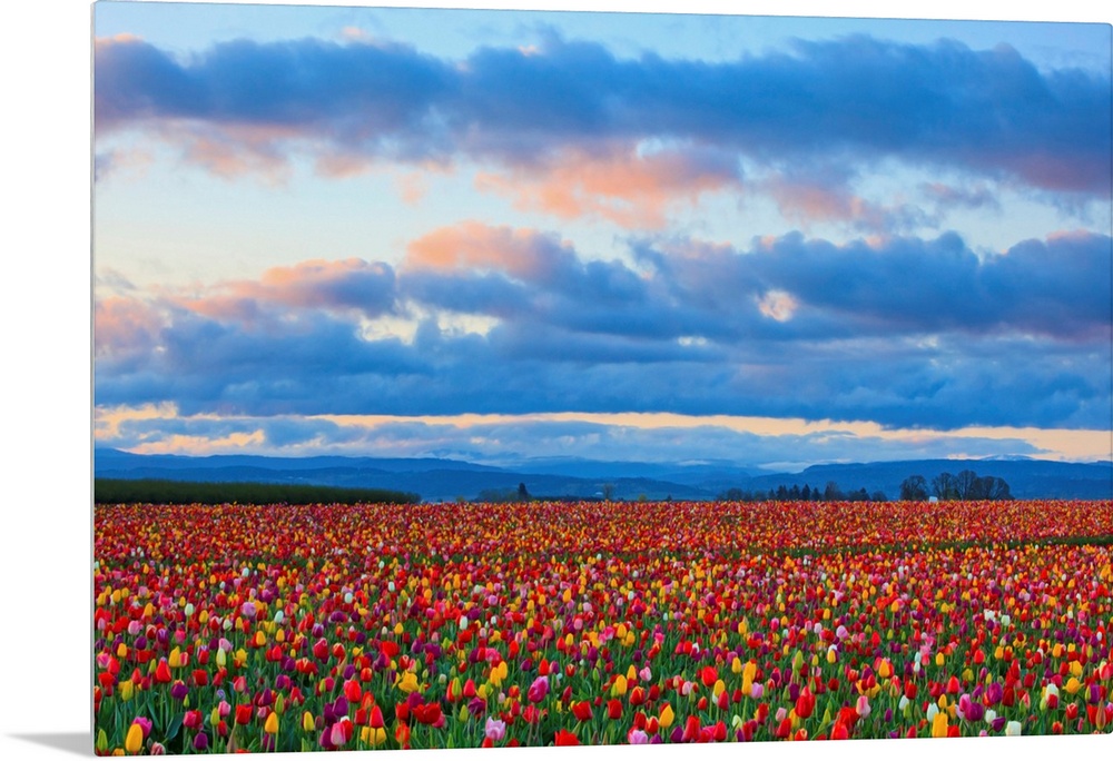 <p>Sunrise Over A Tulip Field At Wooden Shoe Tulip Farm, Woodburn, Oregon</p>