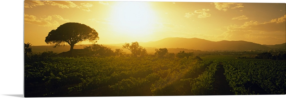 <p>Panoramic picture taken of the sun as it rises and shines over a large vineyard.</p>