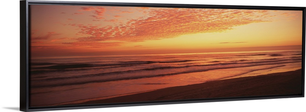 <p>Large, wide angle photograph of a golden sunrise over the Atlantic Ocean, at the shoreline of Daytona Beach, Florida.</p>