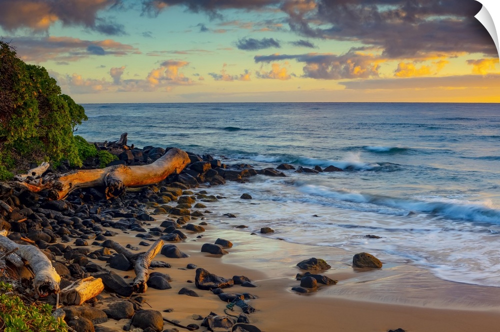 <p>Sunrise over beach and ocean; Kauai, Hawaii, United States of America</p>
