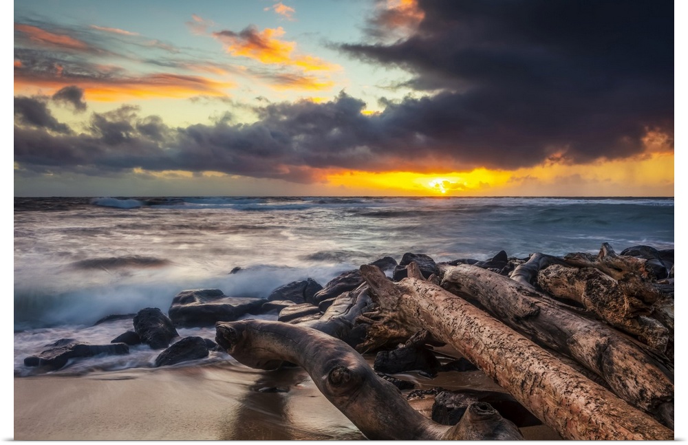 <p>Sunrise over beach and ocean with a storm cloud and rain in the distance; Kauai, Hawaii, United States of America</p>