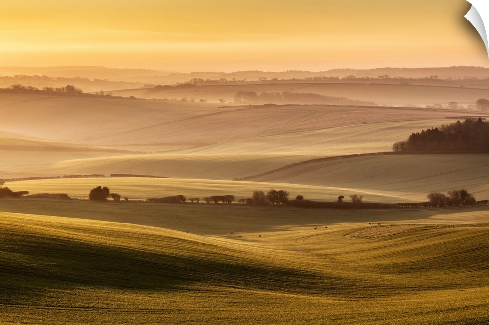 <p>Sunrise over farmland in the Piddle Valley towards Piddlehinton, Dorset, England, UK.</p>