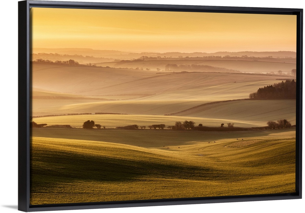 <p>Sunrise over farmland in the Piddle Valley towards Piddlehinton, Dorset, England, UK.</p>